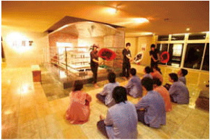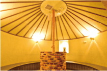 汗溶炉の溶岩にアロマ水をかけ、発生した水蒸気と熱波を室内に充満させ、リラックス効果を高めます。さらに大団扇で扇ぐことで体感温度を高め発汗を促します。