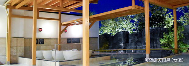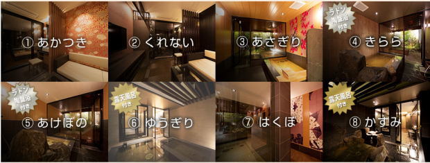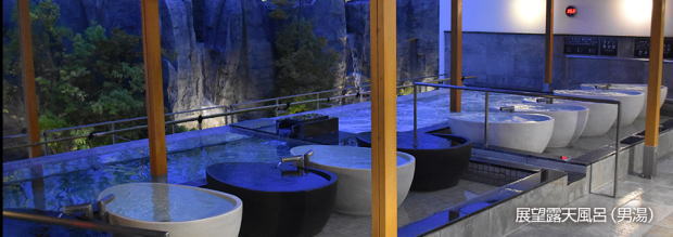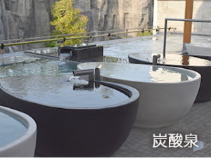 風呂:露天岩風呂、壺風呂、炭酸泉、美泡風呂、電気風呂、替わり湯、ジェットバス、水風呂、ラドン陶盤サウナ、岩盤塩ミストサウナ、貸切個室風呂(8部屋)